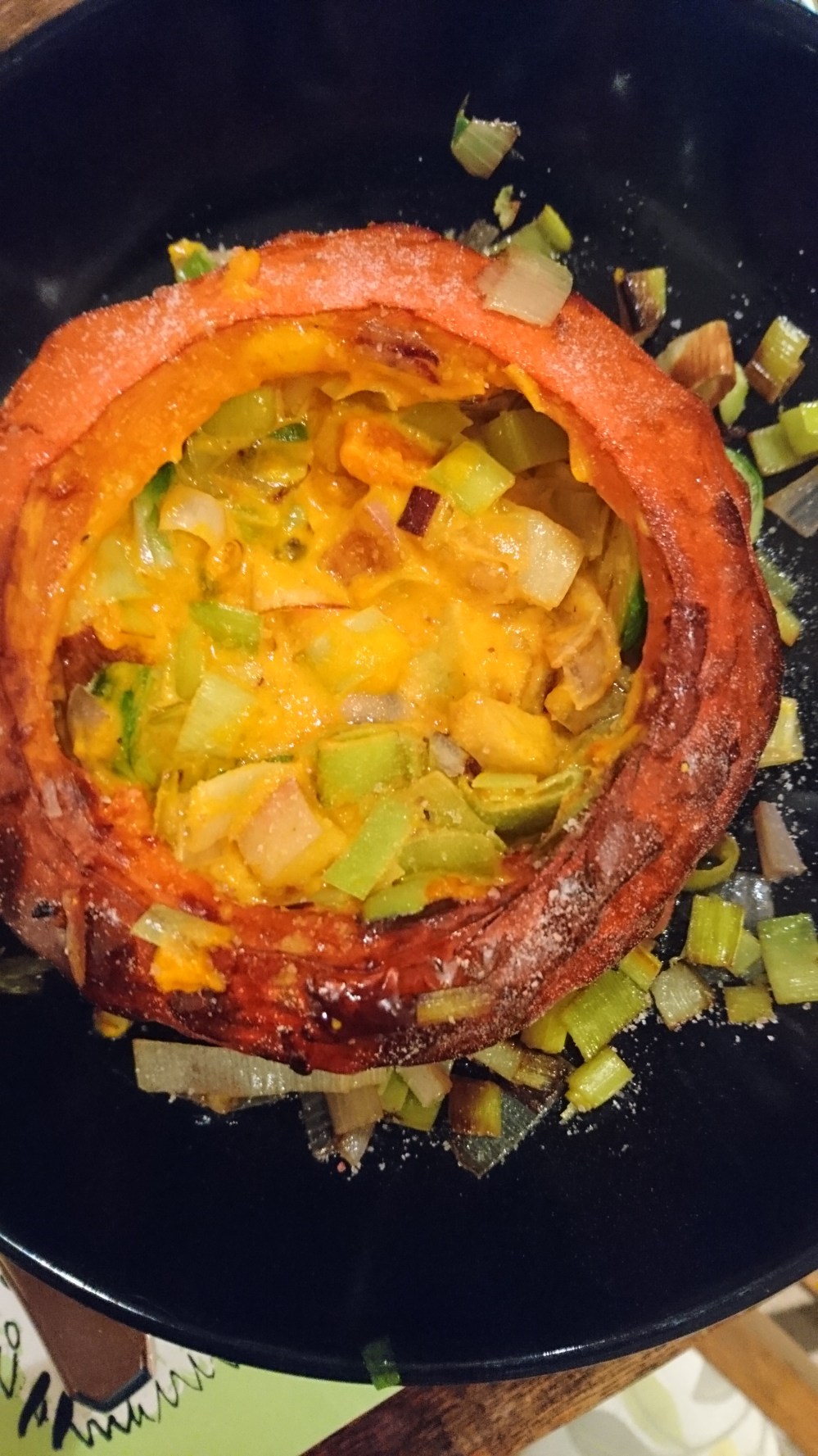 Remove squash from oven and transfer onto plate. Season the inside turning the plate holding the squash so the coconut oil covers all the inside of the squash. Tip in veg. Pour over cream. About 2 tbsp. Gently stir to incorporate some squash with veg mixture.