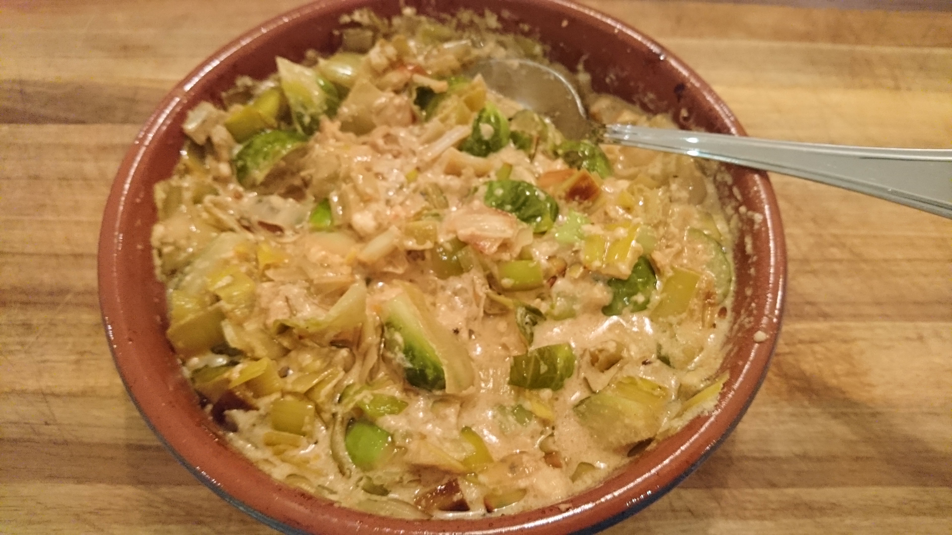 Cook in coconut oil a leek, banana onion and sprouts finely chopped. Cook until soft.