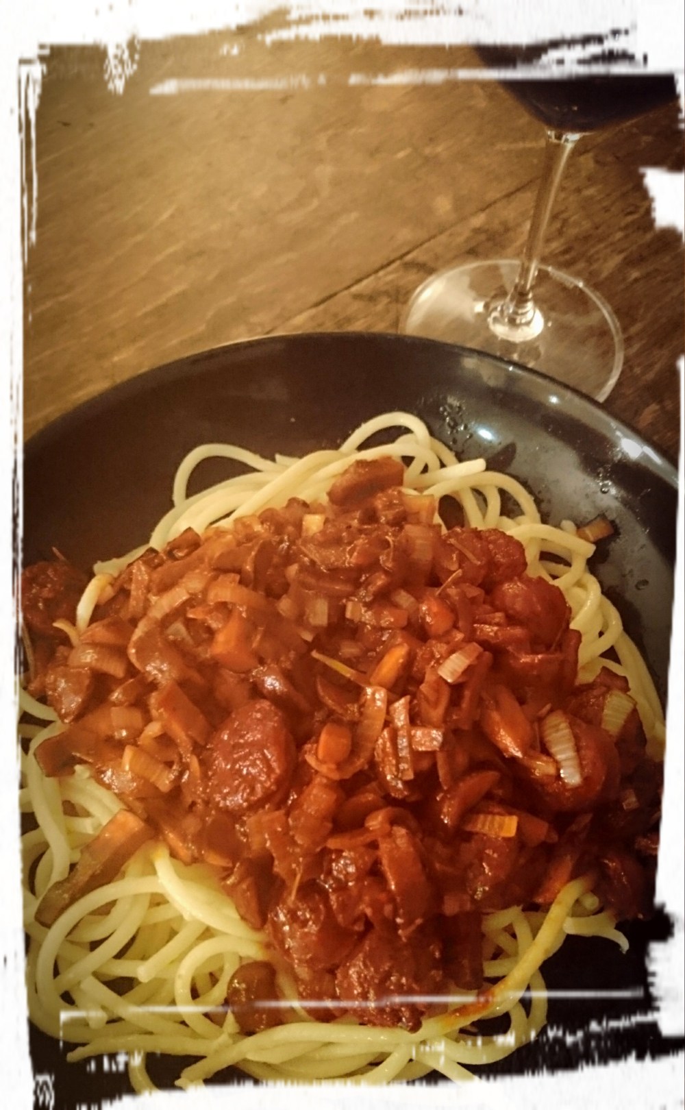 I fried off some chorizo, honey, mushrooms, babana onion and added a splash of red wine and pasta cooking water to slacken the sauce.