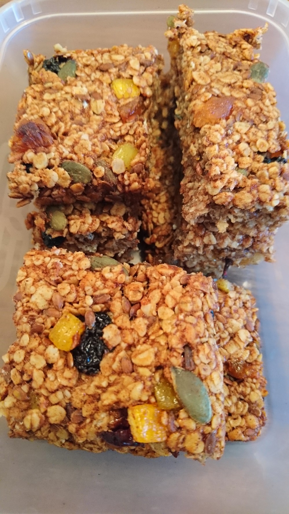 Thanks to Dale Pinnock @themedicinalchef for the basis for these beauties. Delicately flavoured and wholesome, with no refined carbs… What more can you ask for in a break time treat? Peel and puree 2 pears (Dale uses apples… I had only pears and these worked just as well) Put in a saucepan with 2 tablespoons coconut oil 2 tbsp honey 2 tsp cinnamon Melt it all together. Add: 1 tbsp pumpkin seeds 1 tbsp brown linseed A good handful of dried fruit – i used dried cranberries About 5 or so dried apricots snipped into small chunks A tbsp of dried peel Stir it together Add: 180g raw oats Stir and put in oiled a 20x20cm baking tray In a preheated oven at 180’C for 20min Remove and score gently into slices Leave in the tray to cool. Eat.