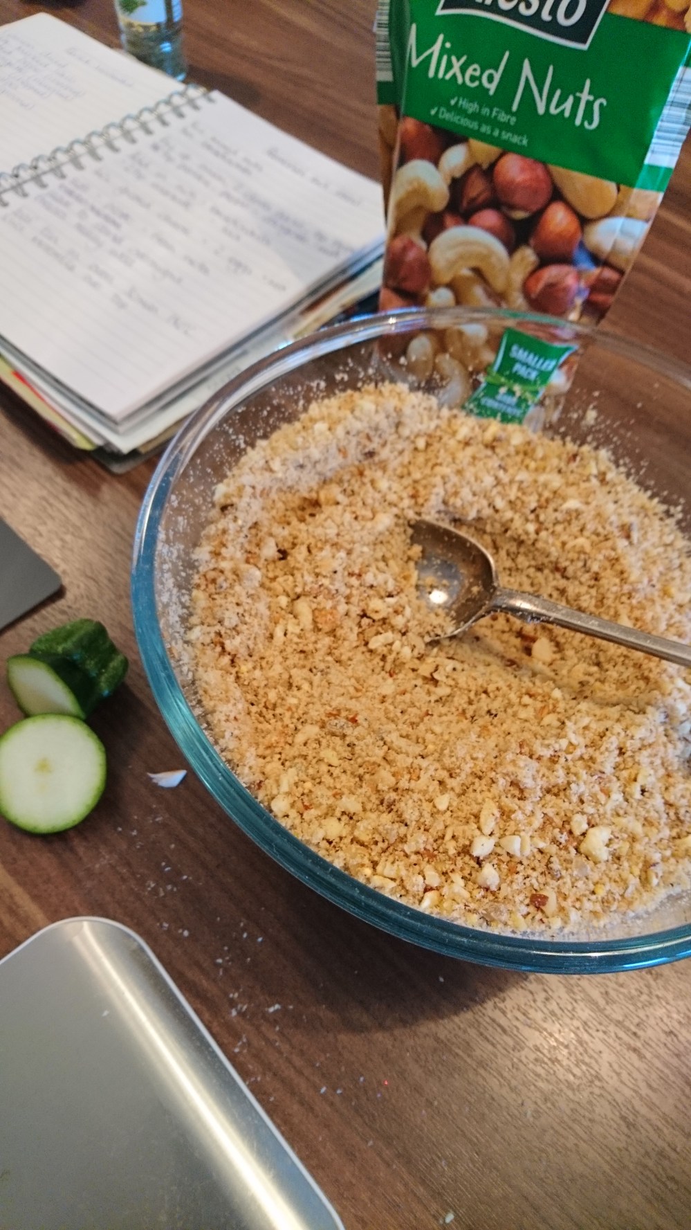 8oz mixed nuts (unsalted) whizzed until small but not powdery. I like the texture.