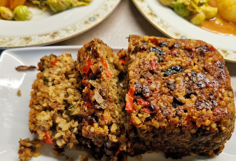 My husband is vegetarian and required a new tradition when he joined my carnivorous family. This nut roast is one of our friend’s family traditions swapped and passed on.