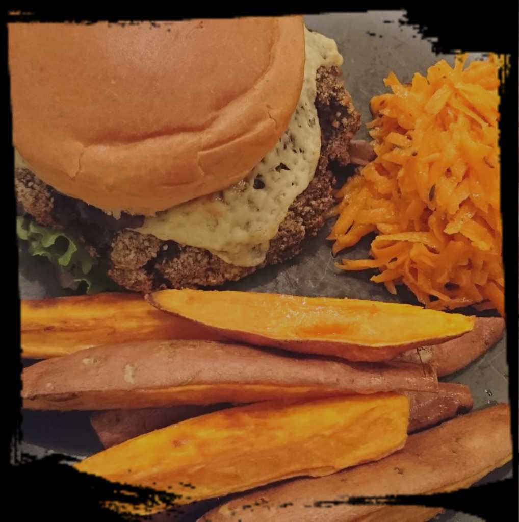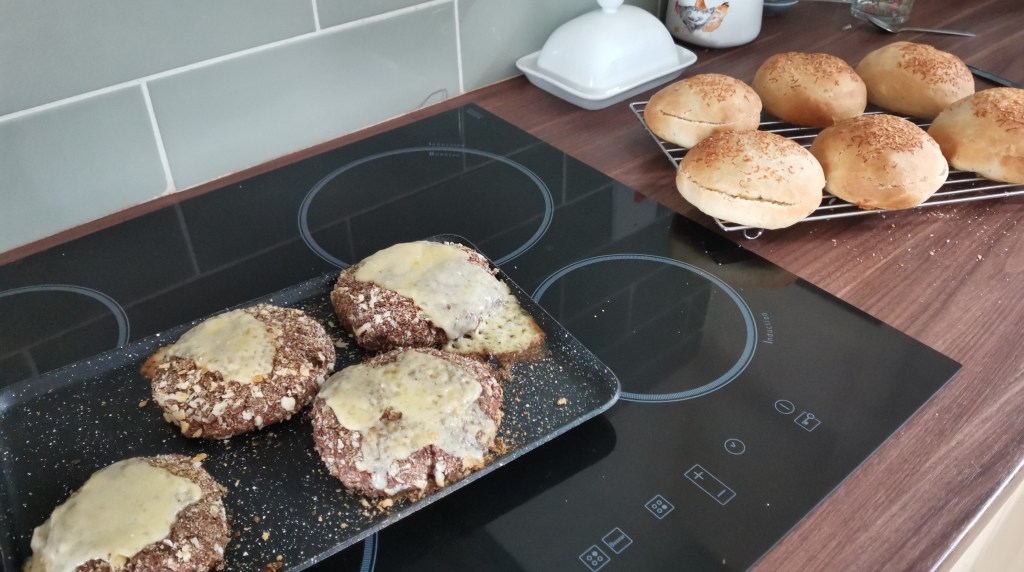Sprinkle the milled linseed on a plate and take wet handfuls of the mixture and polp the on the seed. Turn them over in the seed (this is a bit wet) and place them in rounds onto an oiled baking sheet. Press them into burger shapes.