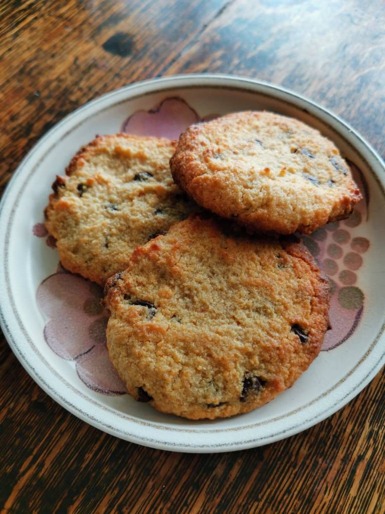 A good shake of dark chocolate chips – or raisins, but the more you add the more sugar will be in the cookie, so go with your own requirement. You could just have a shake of chopped mixed nuts or flaked almonds to keep the sugar low.