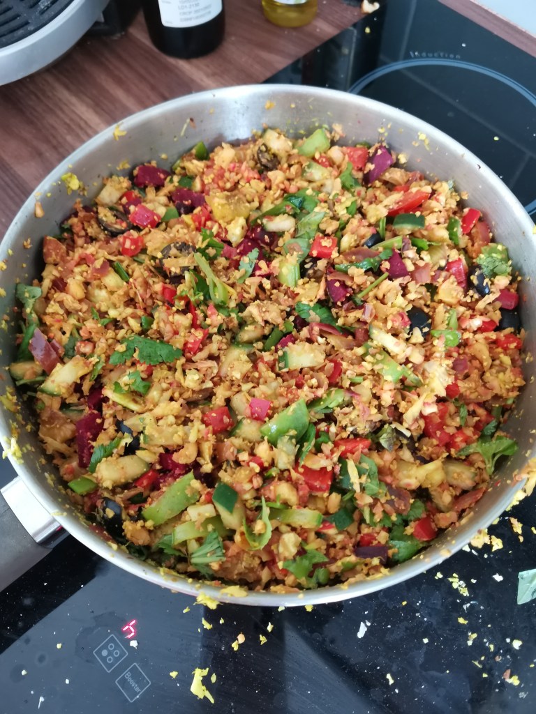 Veg: chopped into small bits. I used: 1 beetroot, 8ish mangetout, 1 red pepper, 1/2 cucumber, 1 large tomato, 8 or so olives