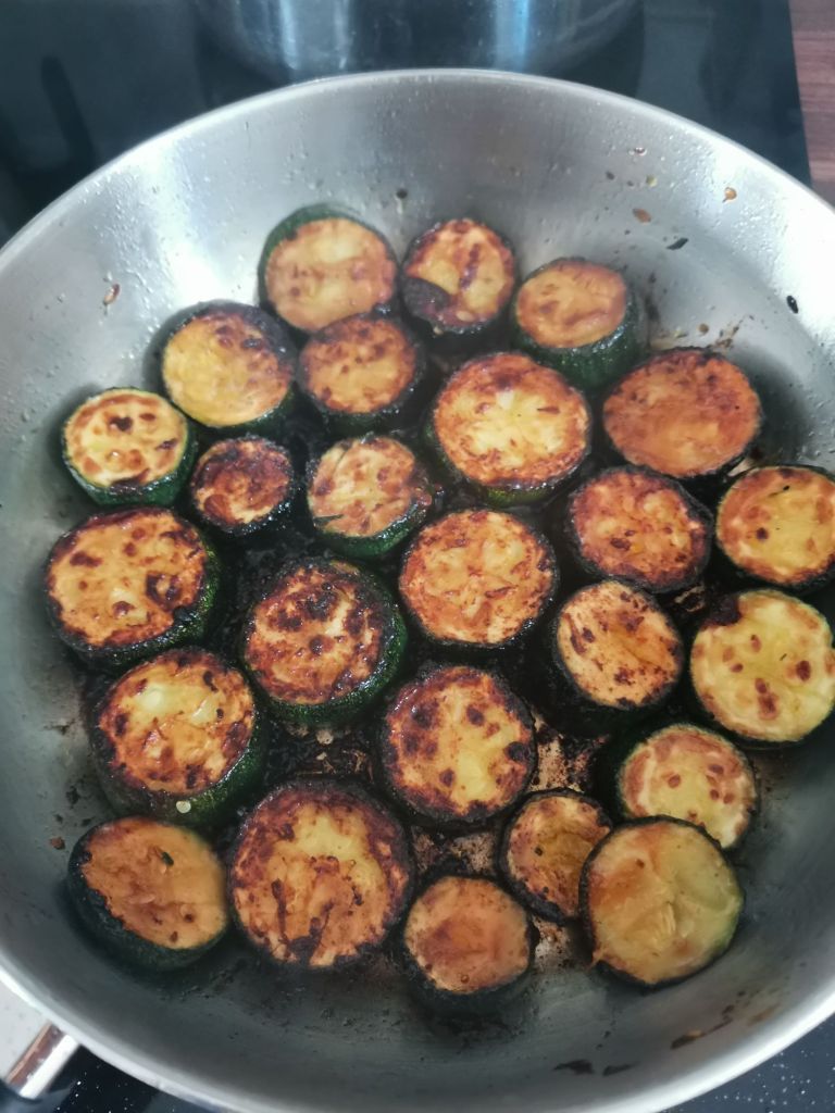 In one large frying/sautee/skillet pan heat some oil until its hot and add the courgettes face down onto the pan base. Make sure the pan is kept hot so the courgette don’t boil in their juices. After 5 or so mins, when the courgette start to brown on the pan side, turn each round over and brown the other side. Keep an eye so they don’t burn.