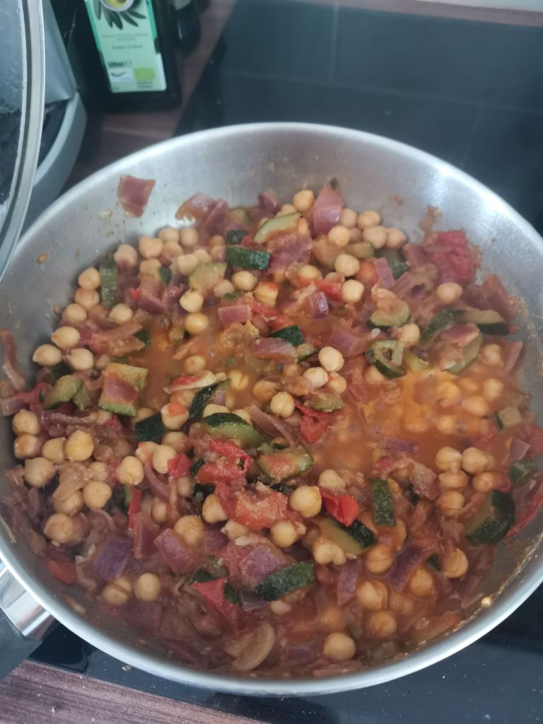 In another frying pan, heat, to a medium heat, some more oil and add the garlic, then onion, then tomatoes and chopped courgette in batches waiting until each is soft before adding the next ingredient. Use a lid to preserve the moisture to keep the vegetables wet. Add splashes of water if needed.